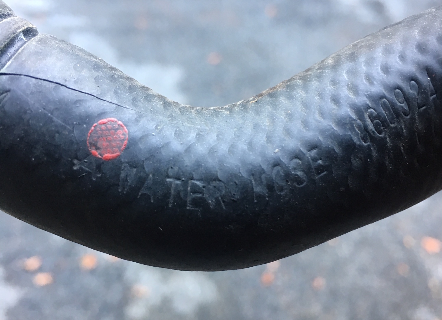 BJH324JH, my hoses had similar markings to what you described, so probably were the original ones on both trucks. A triangular logo, and the words WATER HOSE 860924, but in mine they were not printed in blue, they were stamped. Also, a little red circle marking.