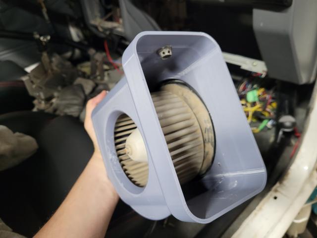 Because of the cage I relocated the HVAC blower. Drew up this piece and 3D printed it. Blower resistor is mounted in it still. Pretty much the only time this will be used late in the evenings in the early spring/late fall. This locates it just behind the glovebox on the left side.