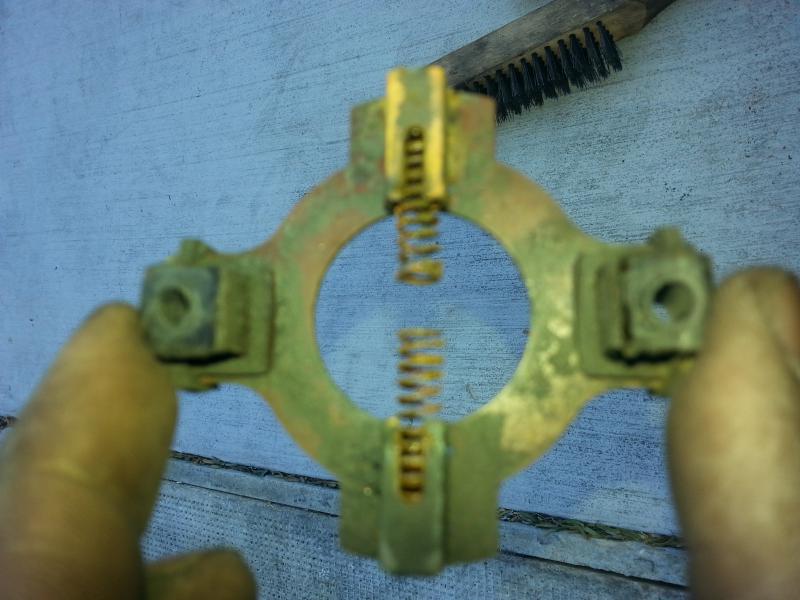 Pics are briefly what I found inside the housing (just three phillips heads screws to open it). Years and miles of normal wear and tear - dust, gunk and corrosion. Scotch Brite, Wire Brush and carb clean later (and long story short), reassembled and reinstalled the working motor and I'm good to go. *Note* the slits in the gold thing holding the springs will allow space for the wires so you can compress the springs with the contact points for reassembly.