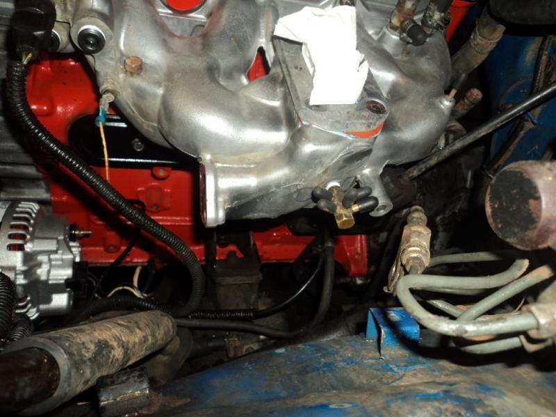 i got rid of the useless vacuum plugs attached to the thermostat housing and plugged them. only the temp gauge is left. since no one makes a block off plate for the machanical fuel pump, i had one made.