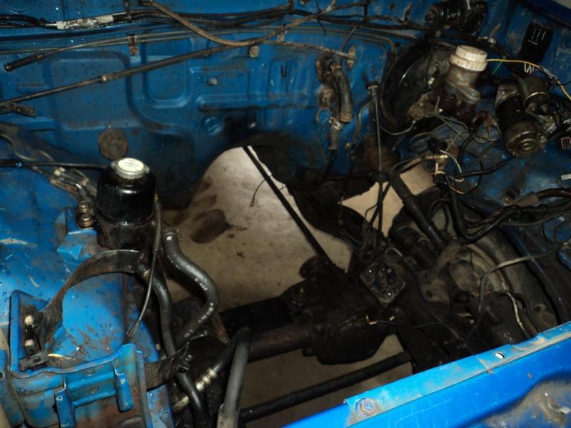 here's the engine bay all dirty. i'll pressure wash it in the morning then the new motor will go in. i still have to eliminate the distributor and coil.