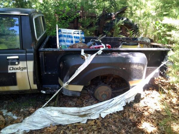 If this guy thinks the bed is worth $1000.00 then good luck and sell it on Ebay. Rear bed flairs are broken and UV damaged. Mirrors are junk. Grill is broken below head light. Does not run. No tires, if the parking brake was on then there is a good chance it will stay on. Dash is toast, interior is toast. There "may" be a usable center console and speedo. I would guess under the foot+ of trash and leaves in the bed it's a rust bucket.