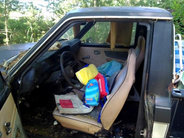 If this guy thinks the bed is worth $1000.00 then good luck and sell it on Ebay. Rear bed flairs are broken and UV damaged. Mirrors are junk. Grill is broken below head light. Does not run. No tires, if the parking brake was on then there is a good chance it will stay on. Dash is toast, interior is toast. There "may" be a usable center console and speedo. I would guess under the foot+ of trash and leaves in the bed it's a rust bucket.