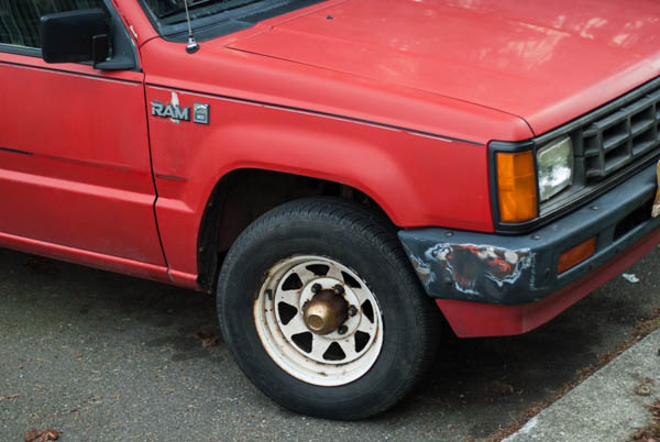 I picked up the Ram 50 about a week ago and I've been trying to whip it into shape ever since. It had been sitting under a pine tree for most of it's life and I washed a small army of pine needles out of the front fenders. The bed of the truck had a pile of rotting wood in it, so that had to go. The chrome rear bumper had faded a bit and was tarnished by some rust. Of course after almost thirty years without a fresh coat of pain the stock red color had faded considerably. The rims on the truck were originally pained white, but over the years the white paint had chipped off in spots and the rims have quite a bit of rust on them now.