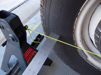 Square off your floor both ways and mark the floor, from (spindle height) the most outside of your wheel or tire. So now you have marks on each side to measure from.