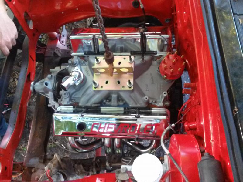 I know abunch of yall are the lowered truck guys but i was doing for little while too but i like fishing and hunting and my truck slammed didnt like the trails... trying to see if these pics are gonna upload. First off bought truck completely stock other than a fuel cell. Found a set of caddy 17s for it and started chopping springs. 3in block in rear with spring pack count down to 2. Rode like this for about 6 to 8 months and then i got a wild idea. Build another daily v8 on full size axles. Having previously done this witj a 88 b2200 sbf,aod,nissan swinging case, chevy axles,41"iroks. I thought i would build a truck i wanted and wanted to keep for a long time. So i cut up my 79 rustbucket chevy and kept everything but frame and cab. 350sbc th400/208,10bolt front,10bolt rear both with lockers and 4.10 gears. Started the tear down. Had everything out of mighty and axle mocked up in a day. Had truck rolling within the week. Pulled motor and trans. Installed body lift and a toyota 89 up ifs steeting box.stripped harness down and cleared out engine bay. Painted it a bright chevy red orange. And started on building my engine the way i wanted it. When in my chevy didnt care about looks but now i do. Motor is sbc 350 one piece rear main 4bolt main block,worked double hump heads,big summit cam,wide ass open intake,billet dizzy and streetfire msd ign box. After some paint and chrome parts finally looking good.
