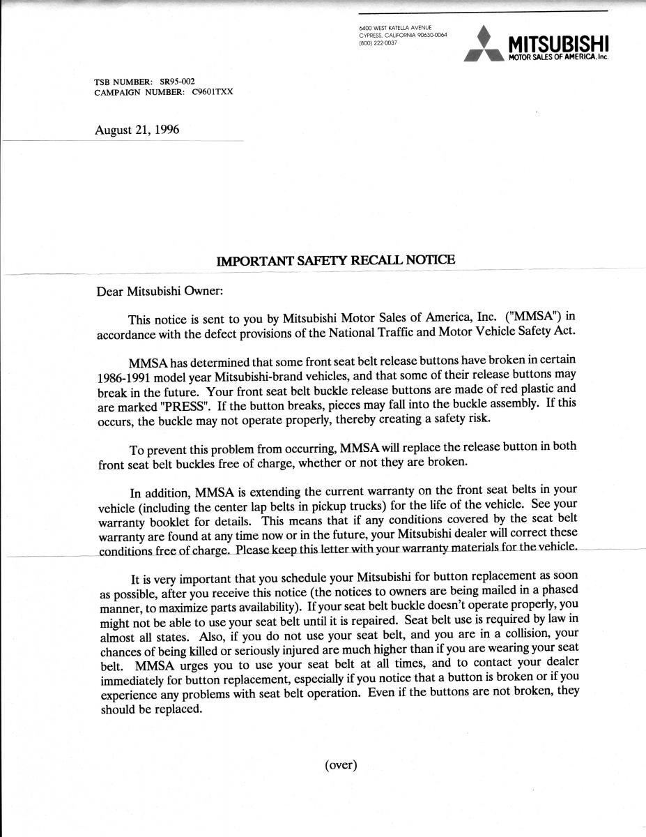 Those of you that have just purchased your first Mitsubishi / Dodge truck need to research the federal recall listing on these vehicles. If you have never had it checked for this recall, then you truly need to find out if your truck falls into this requirement. The seatbelts are a must and especially in a collision.