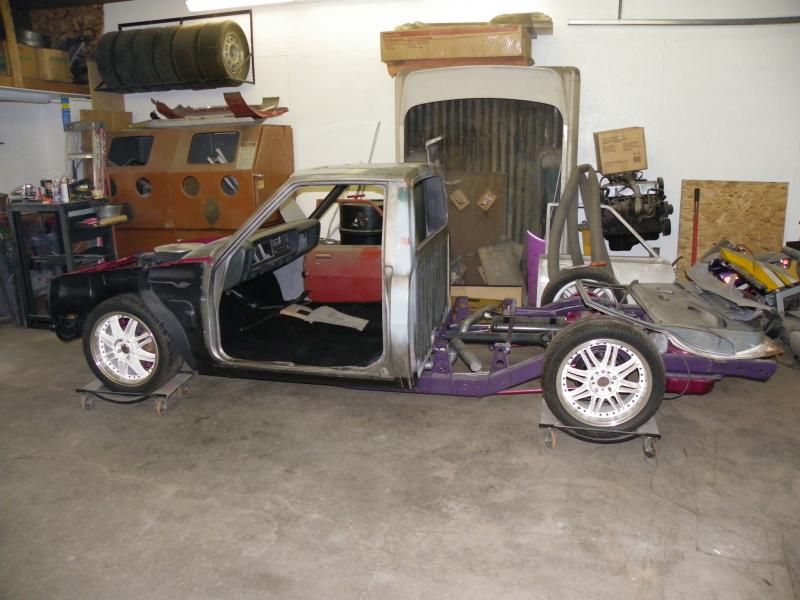 A few months later I found a rust free 83 cab and bought it for $39.99 from a local junk yard.Well next thing you know the frame is stripped, air ride put in, 4 link, 7.5" 3.45posi (Ranger axle) gas tank relocated,full mandrel bent 2.5" duel exhaust,AOD with 2400 stall and a stage 2 shift kit,modified BBK Mustang headers, and 5 lug front conversion. there the truck sat for a few years.