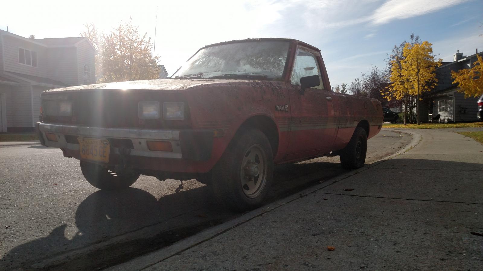 Been wanting to build something cool and unusual and have always had a fancy for mini trucks built for racing like the Datsun Sunny they had on Jay Leno's Garage. So i went up to Fairbanks and picked this up for 200 bucks. Debating about putting a Weber on the factory G63b or swapping something in like a turbo v6 or replacing the head with a DOHC, I'd like to hit around 200hp. But thought I would start a build thread for conversation's sake so here she is! 1986 Dodge Ram 50, Last receipt i found in the glove box was from 1996 so I'm assuming she has been sitting for around 20 years or so.