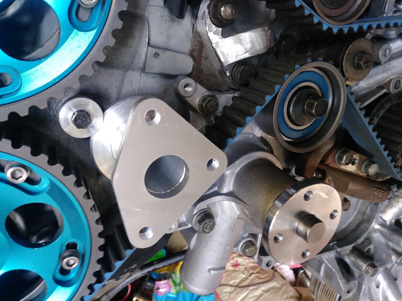 Thank you Prescott. I used the serpentine belt pulley from the eclipse. when you try to put it on the truck waterpump, it sits too close to the block and the center hole is larger then the shaft size. i pressed off the flange from the 4g waterpump,, drilled out the threads of the 4 holes and used short bolts. had to ream out the center shaft hole, well, maybe didnt have to, but was easier to get it on the shaft without pressing on it. and tada, now the old flange acts as a spacer with the correct offset and center shaft hole size to keep the pulley centered on the shaft and belt path. as for the water tube,,, well,,, couldnt find one around here and didnt want to pull it off the running truck so i found an old jack handle that barely fit into the waterpump hole,, used a small round file and carved a groove in the end for an o-ring, drilled 3 3/8 holes where i felt they should be and brazed on the 3/8 water fittings that i cut off the 4g s giant water tube.. using a 90 bent rubber hose to turn the back corner and run to the heater core. as for jays kit,,, yup, would recommend it. dont try to drive the front freeze plug through to remove it. has a casting flash behind it that makes it not possible. cut through the middle of it and pull it out the front with a brake spoon like tool. when installed, felt like i could pull it out if i tried to do so, so a liberal amount of rtv sealant and time to cure is now rock solid. i do believe that i will drill and tap the rear blocking plate with a small fitting and run a tube from it to a fitting on the front so at least a little bit of flow leaves the back of the head to prevent stagnation.. will post more pics as i go.. Thanks,, Mike