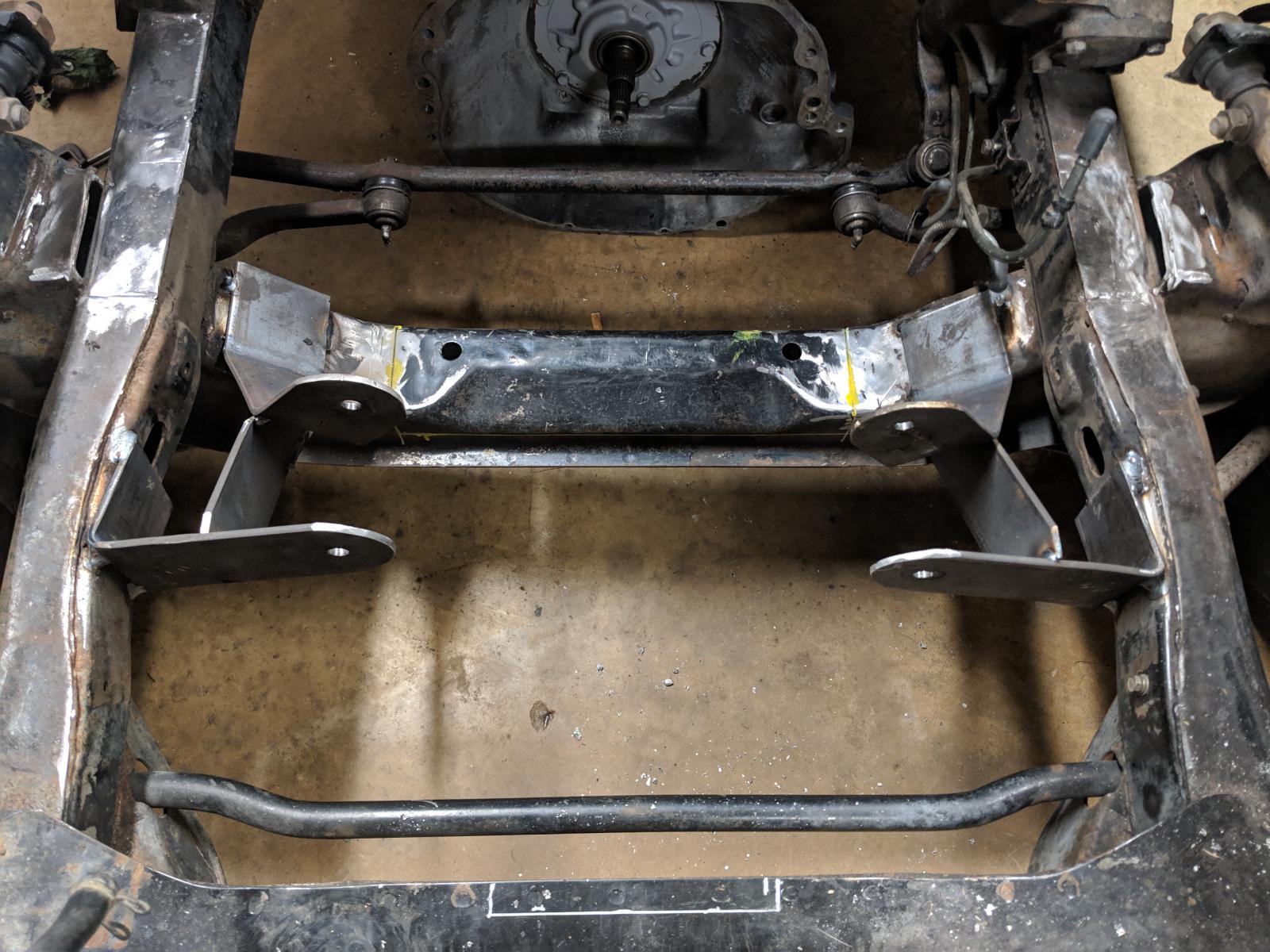 I got the motor mounts tacked in today for the V8 swap. Used 3/16 x 3 bar stock.