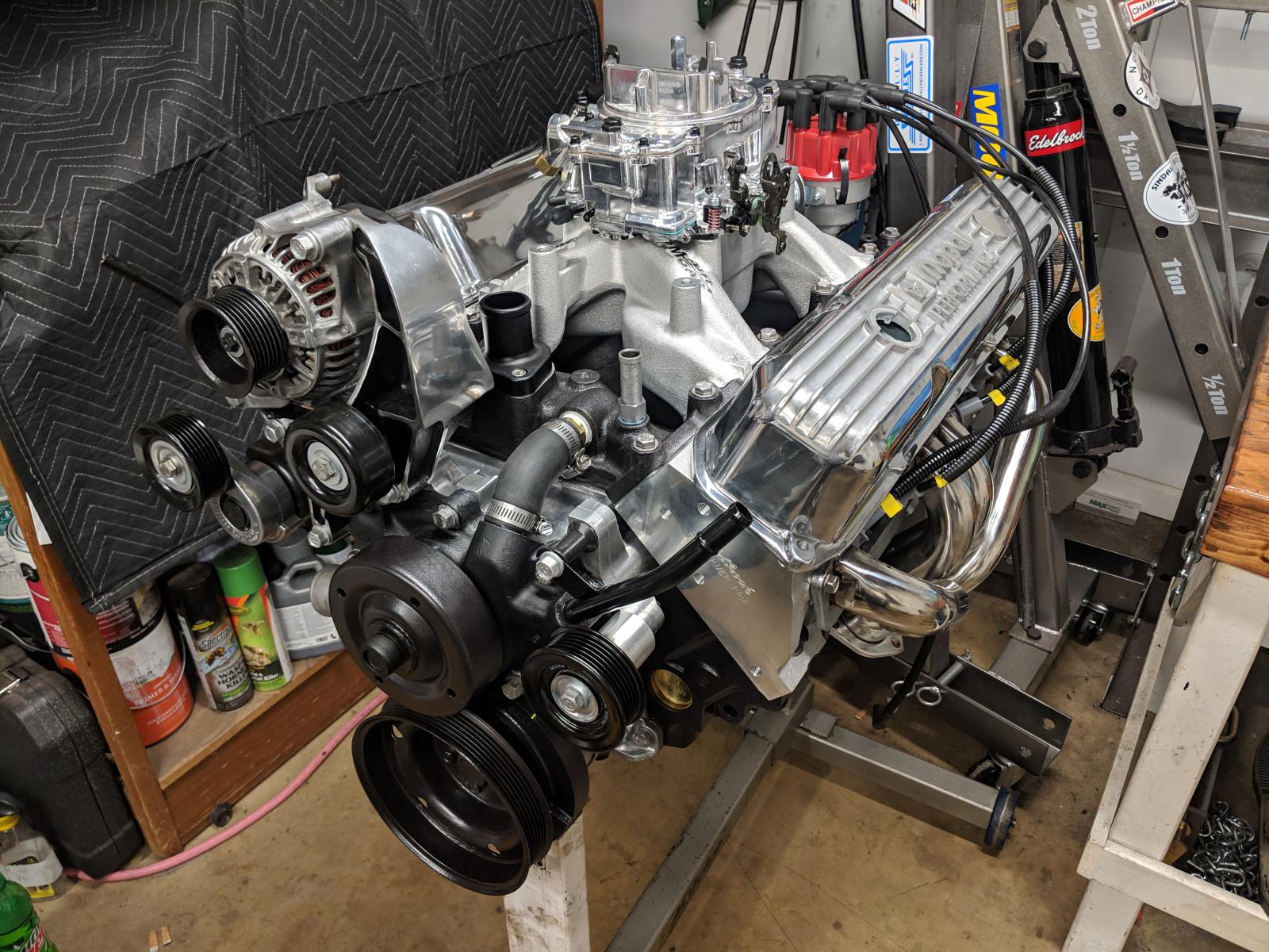 A little about the engine, It's a 5.9 magnum out of a '98 truck. It has a balanced bottom end, flat top standard bore pistons. Fairly large street/strip cam from Hughes, aluminum heads running 10.7 to 1 compression. On paper it should produce 450hp/450torque. If anyone wants more specs I can provide more details.