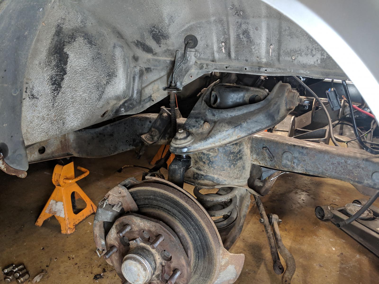 I will be changing thing up down the road with drop spindles and gen 2 brakes. Does anyone know if the upper control arms from gen 1 and 2 are interchangeable? I like the idea of having rubber bushing in the upper control arm. So, as things are now this is what it looks like.