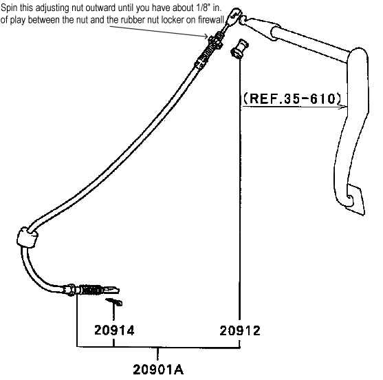 One thing occurs to me now: there should be a rubber bushing, about a 1/4" thick and sandwiched between washers, between the adjuster star nut and the firewall fitting where the cable passes thru. Has that bushing perhaps gone missing?